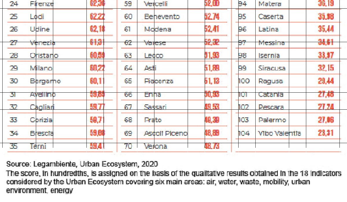 The dossier reveals a two-speed Italy: the first dynamic and attentive to new urban planning choices, mobility services, renewable sources, the progressive return of the city to its citizens, the growth of green spaces. The second, more static, still shows too “slow” a trend in improving the environmental performance of cities, especially in terms of smog, transport, waste separation and water management.
